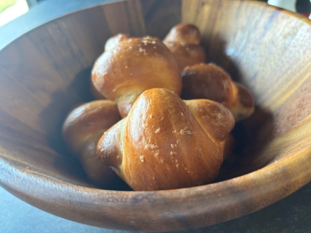 材料が見当たらず😅ミニ塩バターロールパンのようなものを焼きましてブレックファースト✨